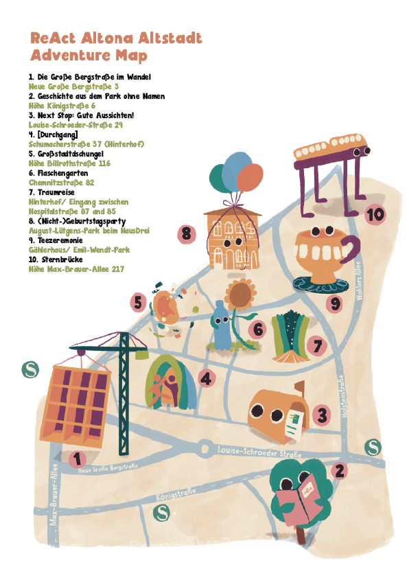 In 2021 I worked together with Haus Drei Stadtteilzentrum. And I made illustration and editorial design for three different published zines. In the adventure map zine, visitors following the map and finding qr codes/games or zines which helps them to get to know the Altona Altstadt better.